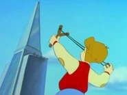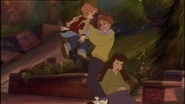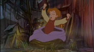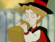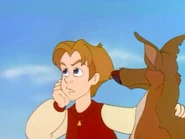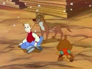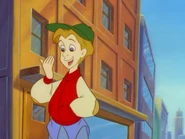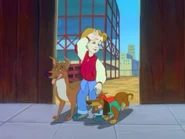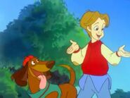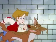 In the movie after Charlie and Itchy meet Sasha in the dog bar she takes them outback where she introduces them to a little boy she has named David who has runaway from home. When Charlie asks David why he ranaway from home he said because his Mom died and that his Dad has married again and now his Dad and Stepmom are gonna have a baby together and he believes that they won't love him anymore. He also tells Charlie that he hopes to do magic tricks and become famous and when he finds out that Charle is an angel he believes that Charle is his gaurdian angel. Charlie offers to help David be a successful magician if David helps him retreve Gabrel's horn which is in the San Francisco Police Station to which David agrees to. At the police station the 4 of them sneak into the back unaware that David's Dad and Stepmom are there and have left a photo of him to the police in case they find him. David, Charlie, Itchy, and Sasha find the horn in a locked up cage and quickly retreve it and run as fast as they can for the exit but David accidently bumps into a female police cop who recognizes him from the picture his parents left and tries to chase him but luckily he and the others escape on a red scooter. Afterwards Charlie helps David become a magician (Easy Street) by acting out for a group on the streets which goes well but soon becomes a disaster and David and the dogs are left in the streets in the rain without money. Once they take shelter, Sasha tells David that although his Dad and Stepmom are gonna have a kid together, they will always love him and that parents can love more than one pup (child). Charlie also reveals that he ranaway from home when he was a puppy and never saw his parents again and that David's Mom will always watch over him from Heaven to which David says he'll go home again if Charlie takes him (and he hugs Charlie, prompting him to put one of his paws around him), but then Charlie becomes invisible after the collar that made him visible disappears, and David believes that Charlie has left, and he and Sasha go to the train station to find the train home sadly. At the train station David's magic card falls out of his pocket but as he goes to pick it up Charlie's old nemesis Carface (who is working for Red the Cat Devil) appears and kidnaps David just as Charlie arrives and orders Charlie to bring Gabriel's horn to Red's hideout Alcatraz in 1 hour or else David will be killed. At Alcatraz David is put into a cell as Red and Carface wait for Charlie who shows up with the horn and sets David free but as they try to escape Red plays the horn.