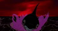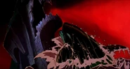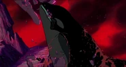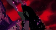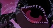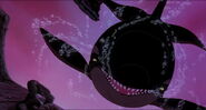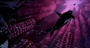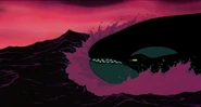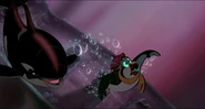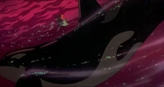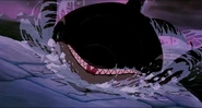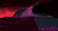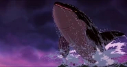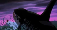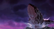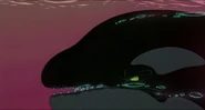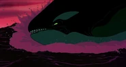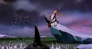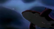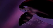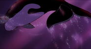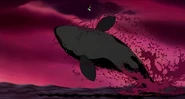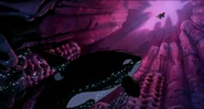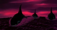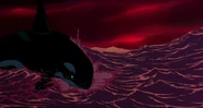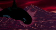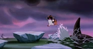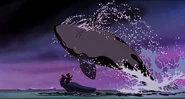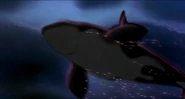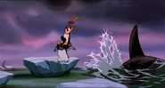 Alarmed, Hubie grabs the pebble in his beak and swims as fast as he can back toward the surface with the two hungry orcas pursuing him. Again, he loses his pebble as it sinks toward the bottom. Narrowly avoiding the bite of one of the orcas, Hubie makes it to the surface, where the orca tries unsuccessfully to crush Hubie under its weight as it crashes down on the water. Rocko takes Hubie's hand and tells him to swim for the sinister looking iceberg while he lures the orca whales away. Hubie protests against it, but Rocko persists. They both turn and see an orca swimming fast towards them, prompting Rocko to yell for him and Hubie to flee. They dodge the orca's attack as it bites at them while Rocko also escapes being hit by the dolphin's massive tail fluke. Rocko and Hubie keep swimming as fast as possible with the orcas in hot pursuit, the former yelling at the latter to keep up his speed. As Hubie keeps swimming for the berg, Rocko turns around and swims back the other way, fearlessly facing the largest (and presumably the leader) of the orcas in the pod, which opens its mouth and vocalizes menacingly. Rocko hits the dolphin and rolls down its body. As the dolphin lifts its tail fluke above the water, Rocko stands up on its tail and gives one of his loud war was crying. Hubie stops swimming as he hears a loud splash behind him, which prompts him to turn around and yell for Rocko, but he doesn't receive a response. He is horrified to see another orca turning around to swim directly at him and resumes his fast swimming to escape.